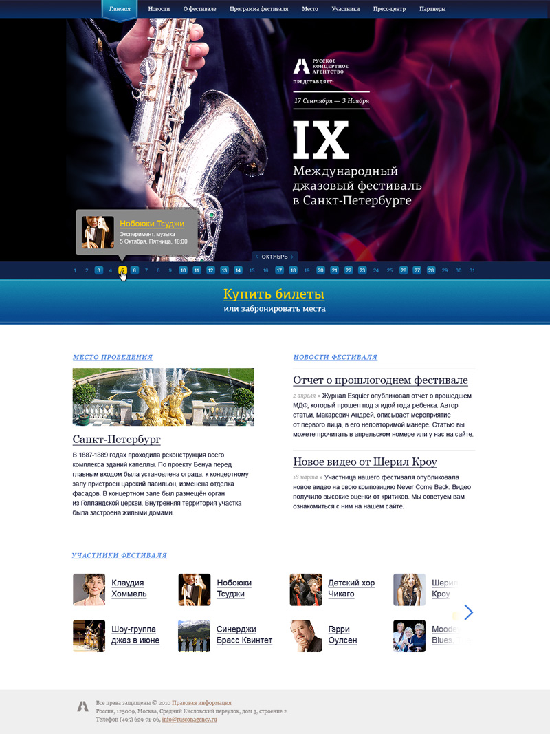 Задача: Разработать концепцию дизайна для сайтов проектов Русского Концертного Агентства, которую можно будет использовать с минимальными изменениями для различных концертов, фестивалей и т.п. мероприятий.